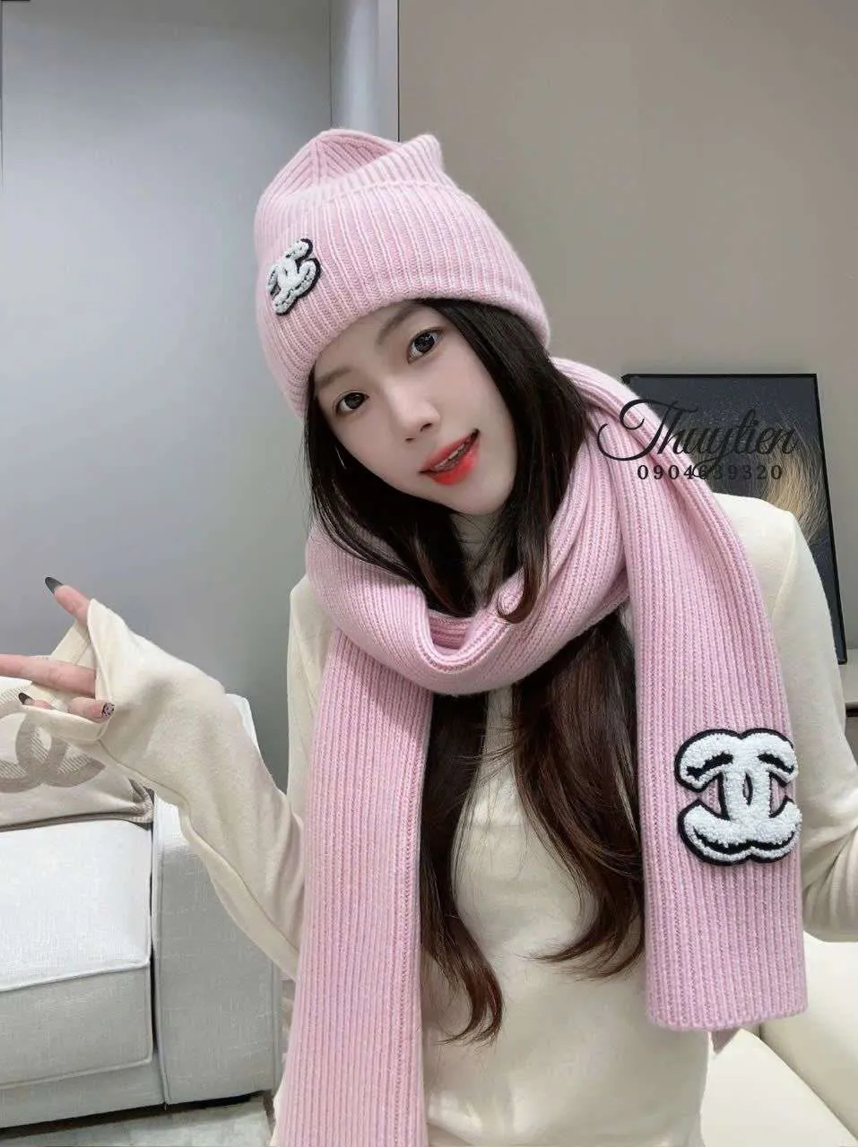 ▪ Phối Đồ Cùng Set Khăn Mũ Len Chanel Màu Hồng Be