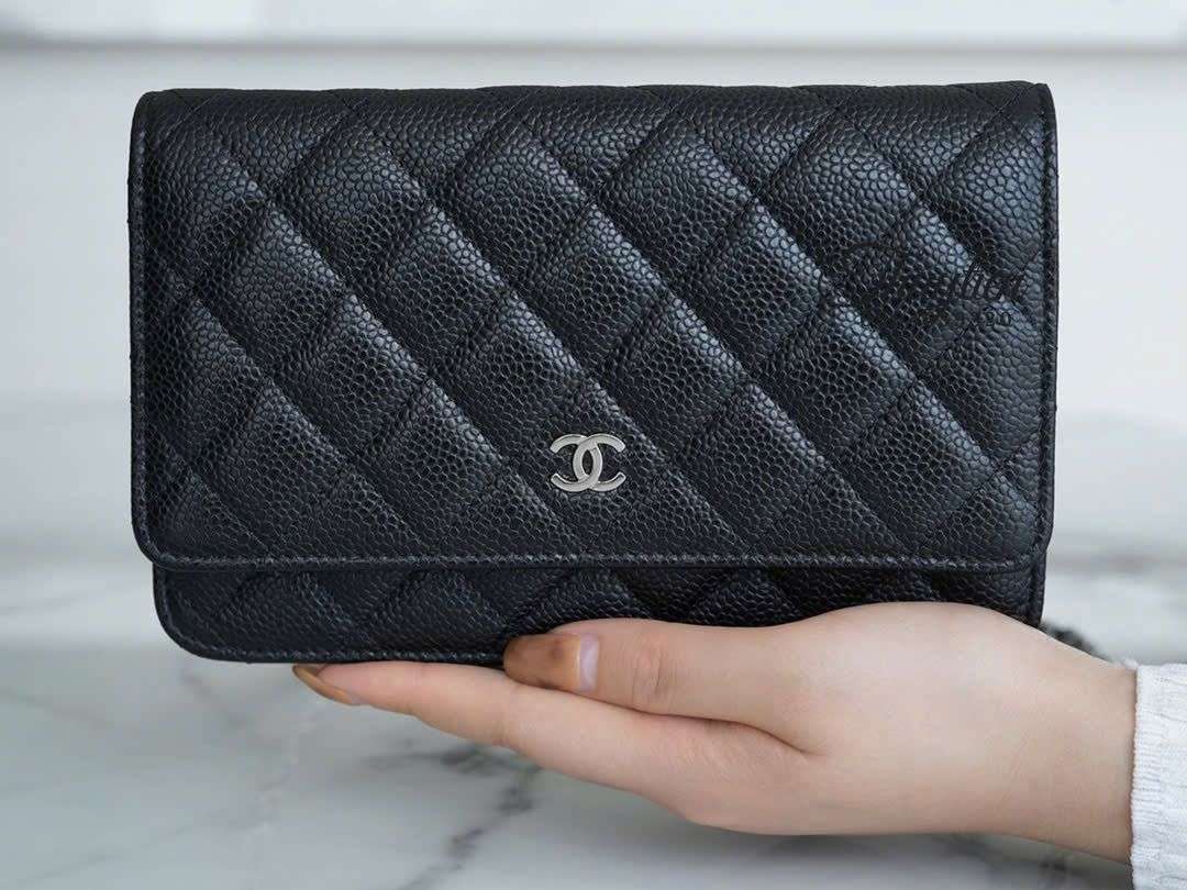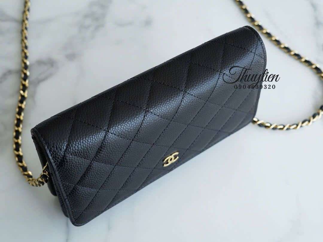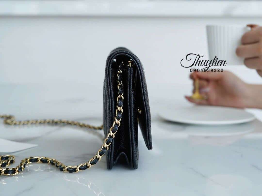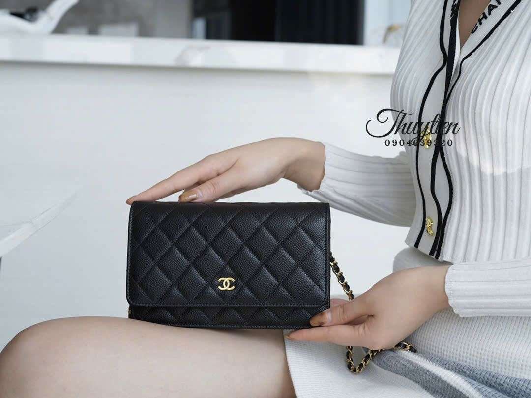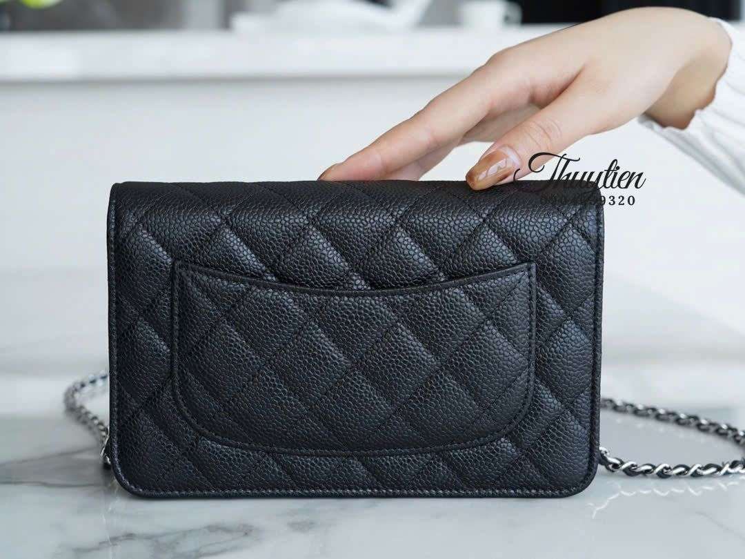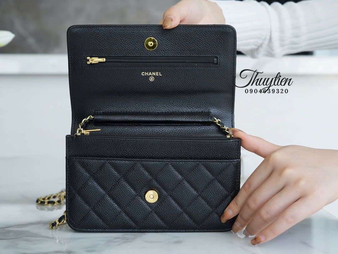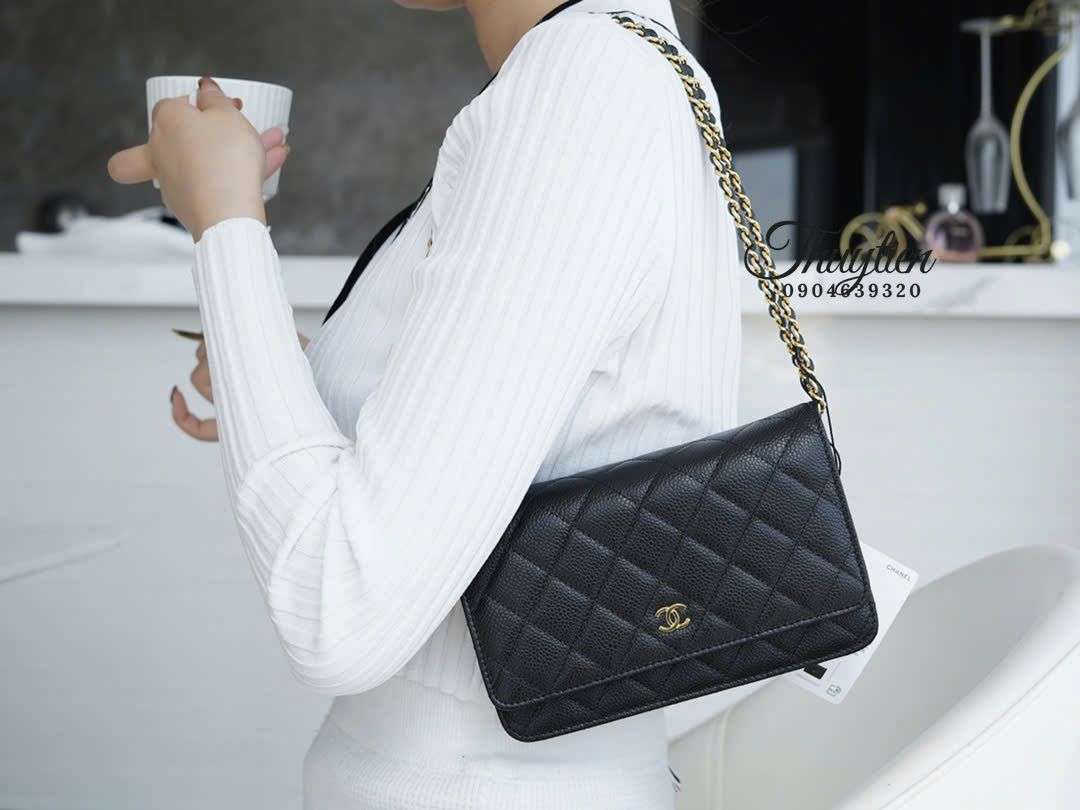 Dù có kích thước mini, WOC da Caviar lại được bố trí khu vực chứa thông minh: dạng ví cầm tay kéo dài, mở ra bên trong là các ngăn trải dọc tạo chiều sâu sử dụng. Cộng thêm dây đeo xích mảnh sang trọng, người dùng có thể chuyển đổi linh hoạt thành crossbody hoặc shoulder mà túi vẫn giữ form đẹp, không bị phồng hoặc méo.