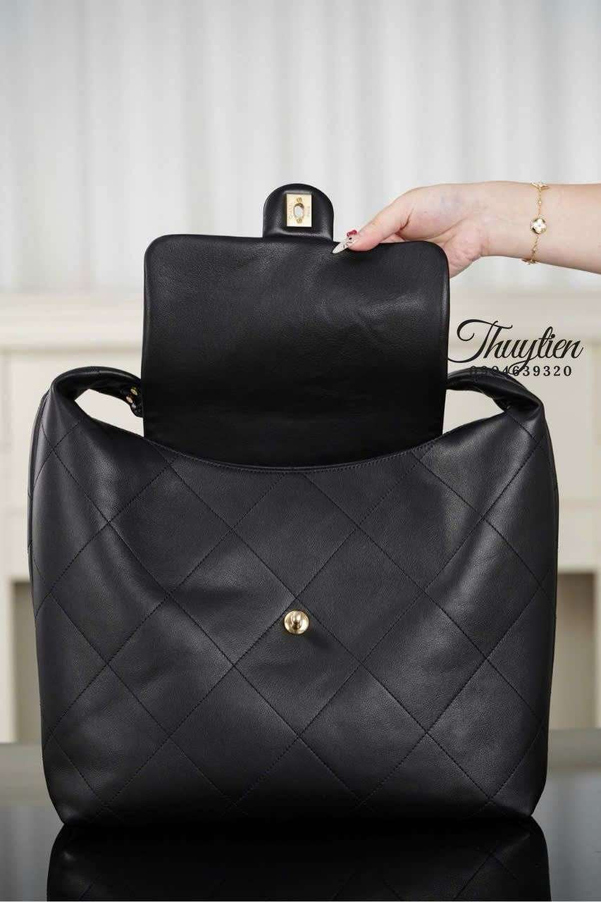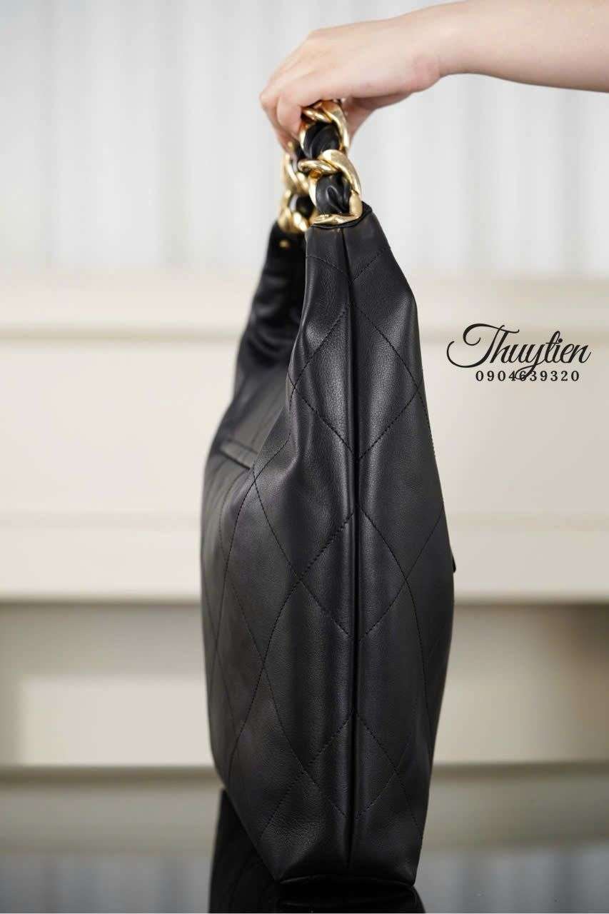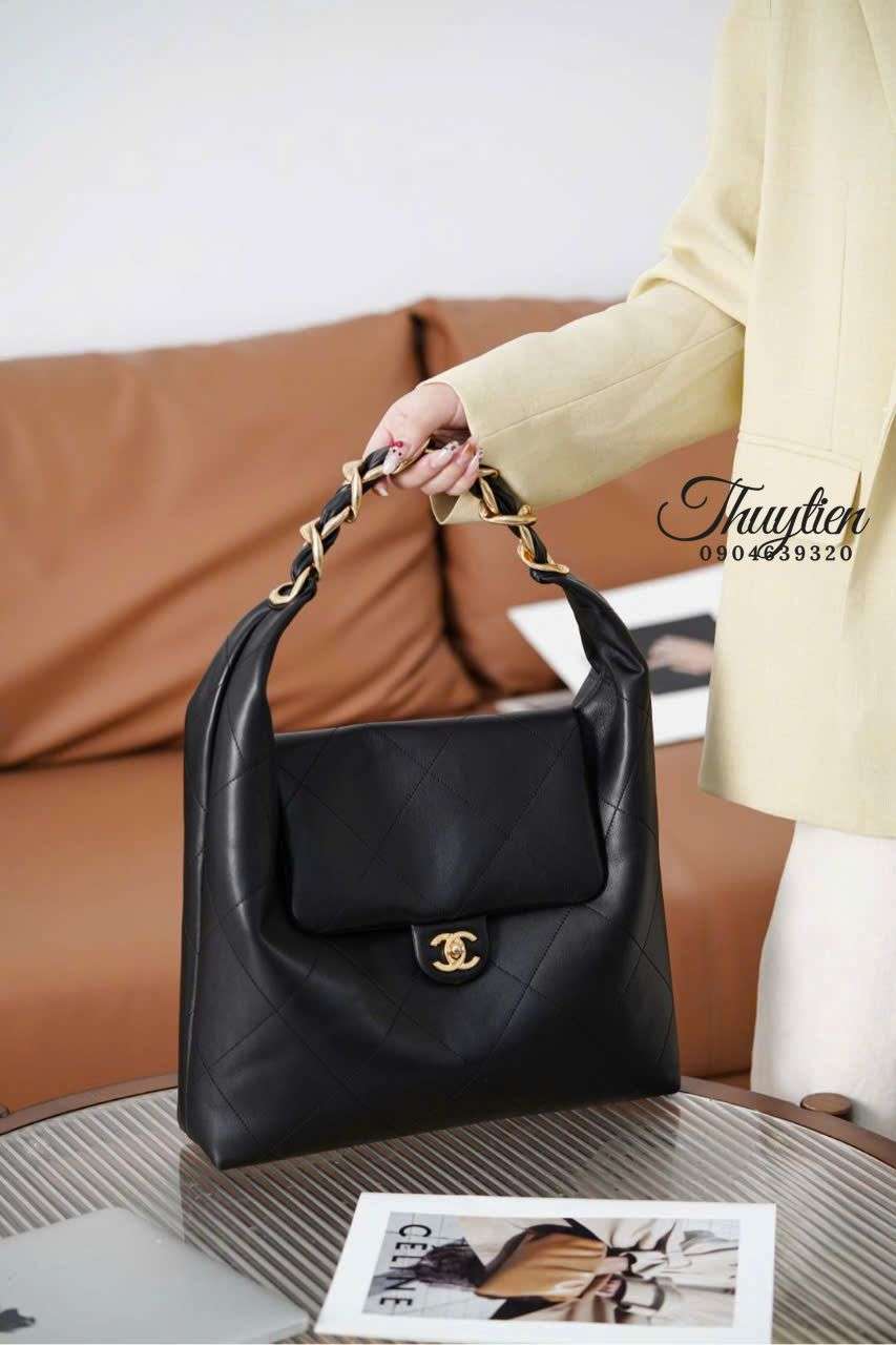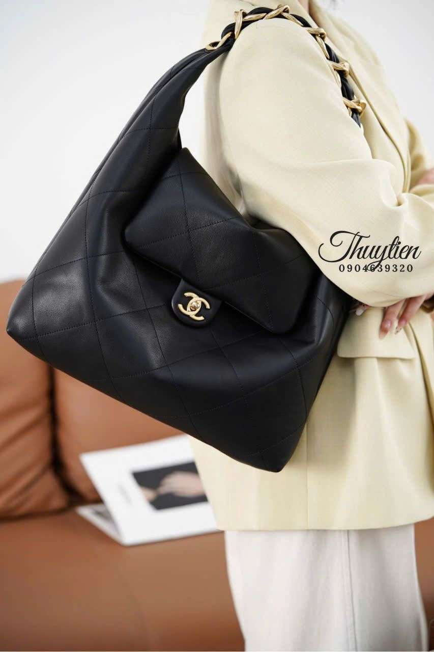 Màu đen huyền bí kết hợp chất liệu da mềm của Chanel Hobo 25K tạo nên cảm giác trầm ấm, thanh lịch và dễ dàng hòa nhập với mọi outfit. Chất liệu được xử lý kỹ lưỡng giúp bề mặt túi mềm mịn nhưng vẫn giữ được độ đứng vừa phải, mang đến sự sang trọng tinh tế khi sử dụng. Đây là yếu tố then chốt giúp mẫu túi trở thành lựa chọn ideal cho các tín đồ thời trang yêu thích vẻ đẹp tối giản mà vẫn khác biệt.