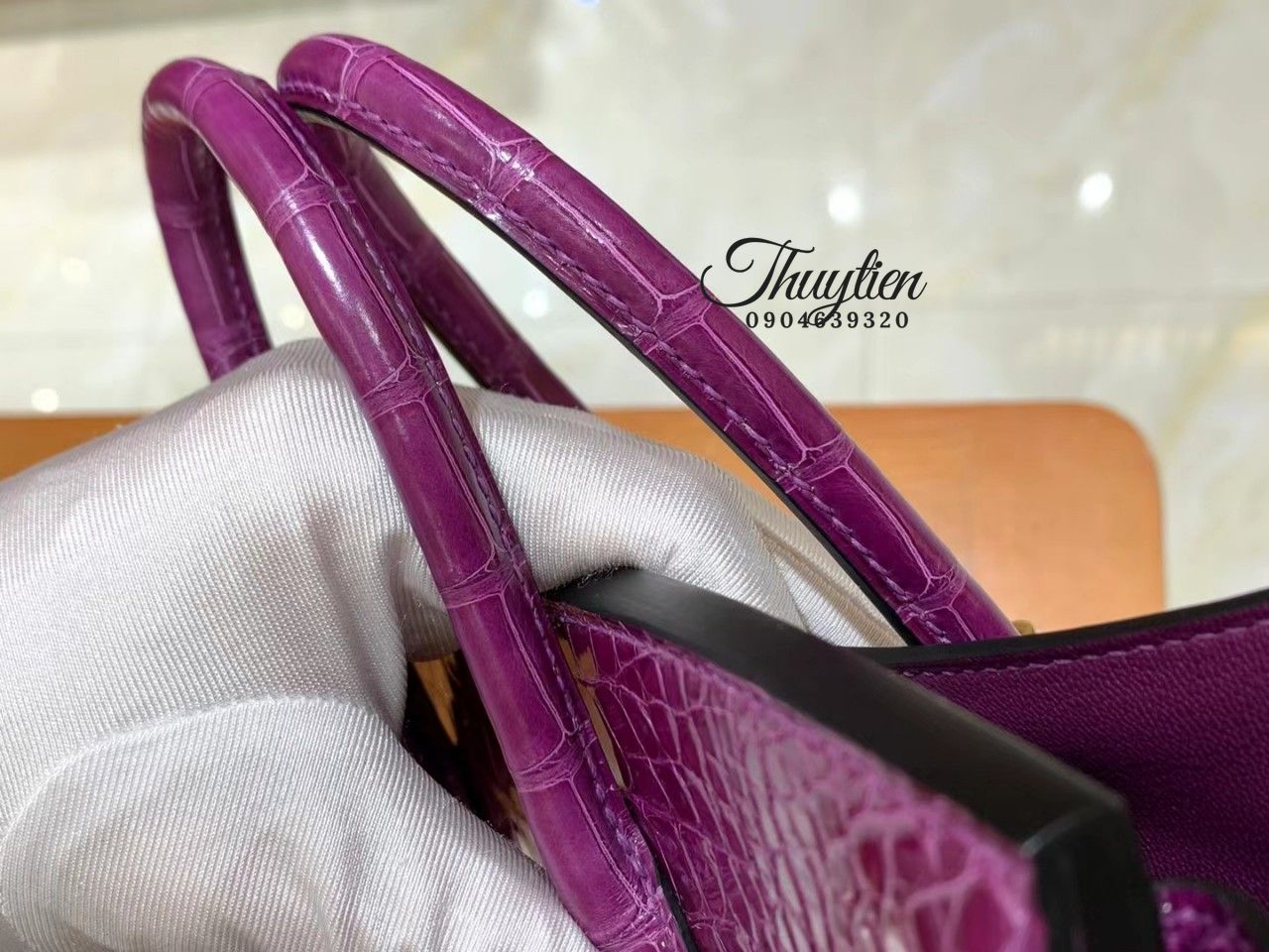 Túi Xách Hm Da Cá Sấu May Tay Thủ Công Màu Tím.