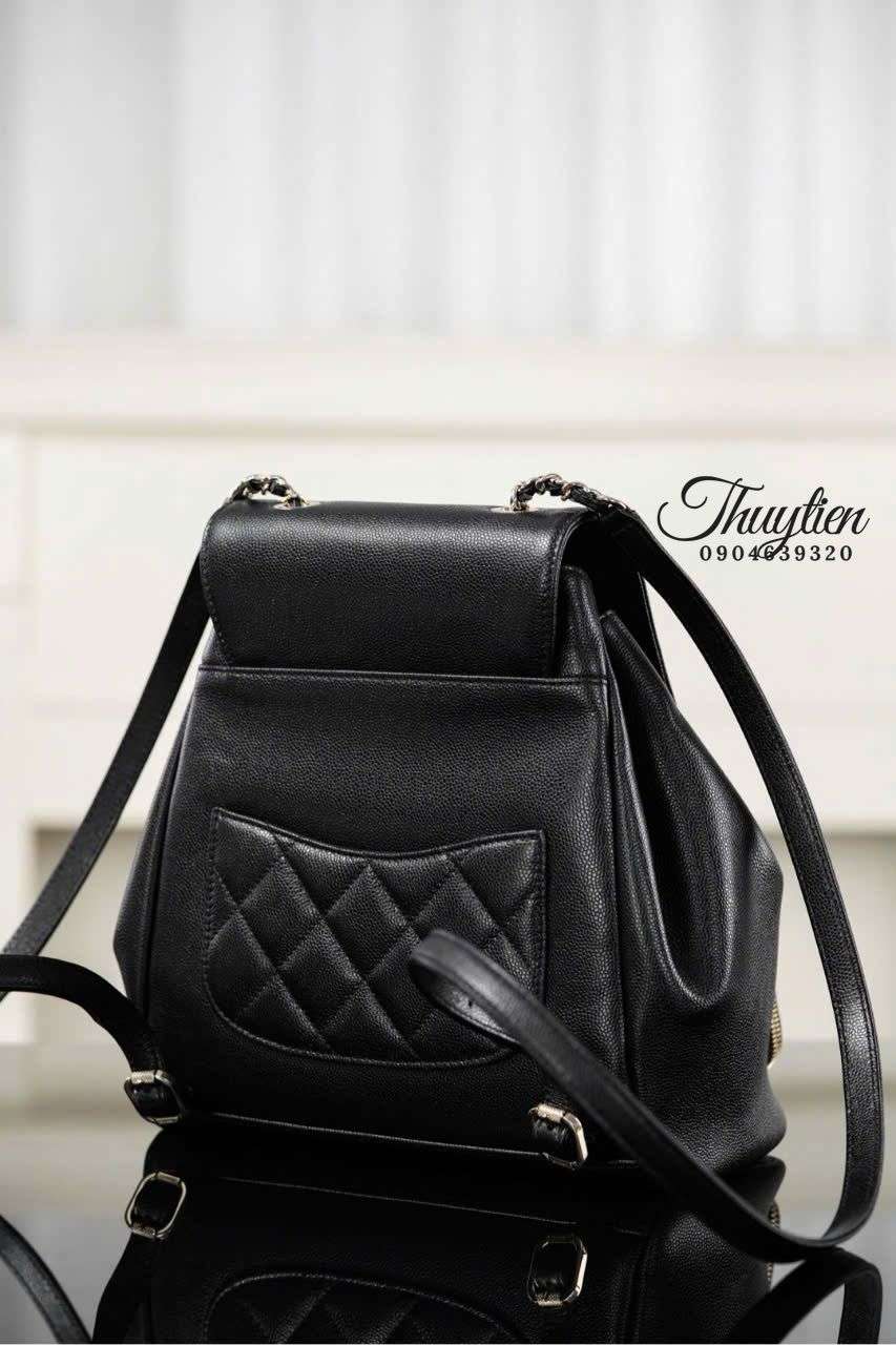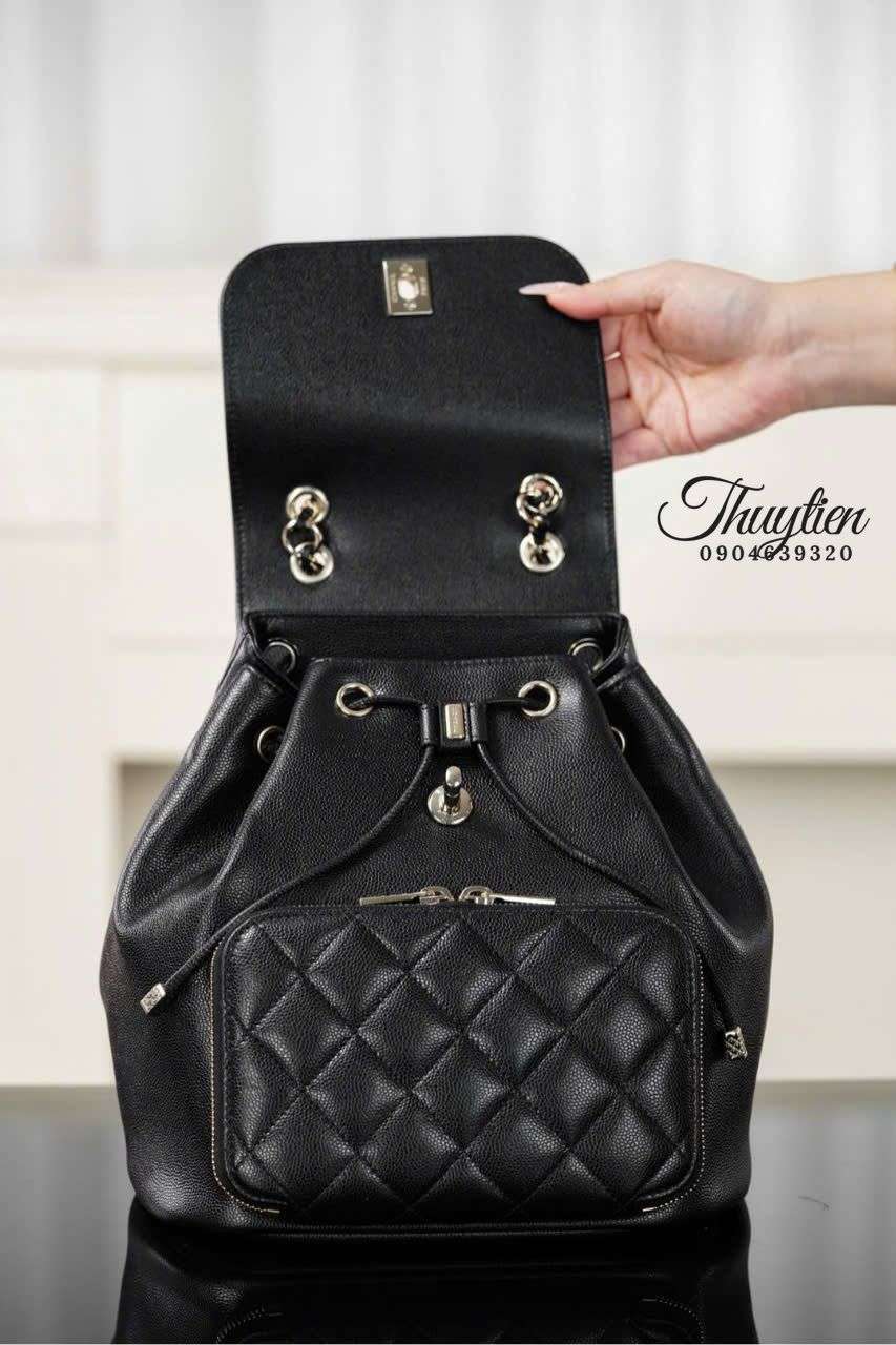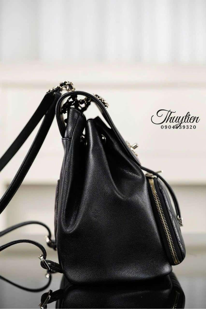Balo Chanel da bê sần nổi bật bởi bề mặt vân mịn nhưng chắc, tạo cảm giác chạm sang trọng và giữ phom tốt theo thời gian. Màu đen sâu mang tinh thần tối giản nhưng quyền lực, dễ hòa phối với nhiều bản sắc gu thời trang khác nhau. Phần dây đeo và chi tiết kim loại được xử lý tinh tế, tạo điểm nhấn mà không cần sự phô trương. Đây là lựa chọn phù hợp cho người yêu thích fashion statement kín đáo nhưng có chiều sâu.