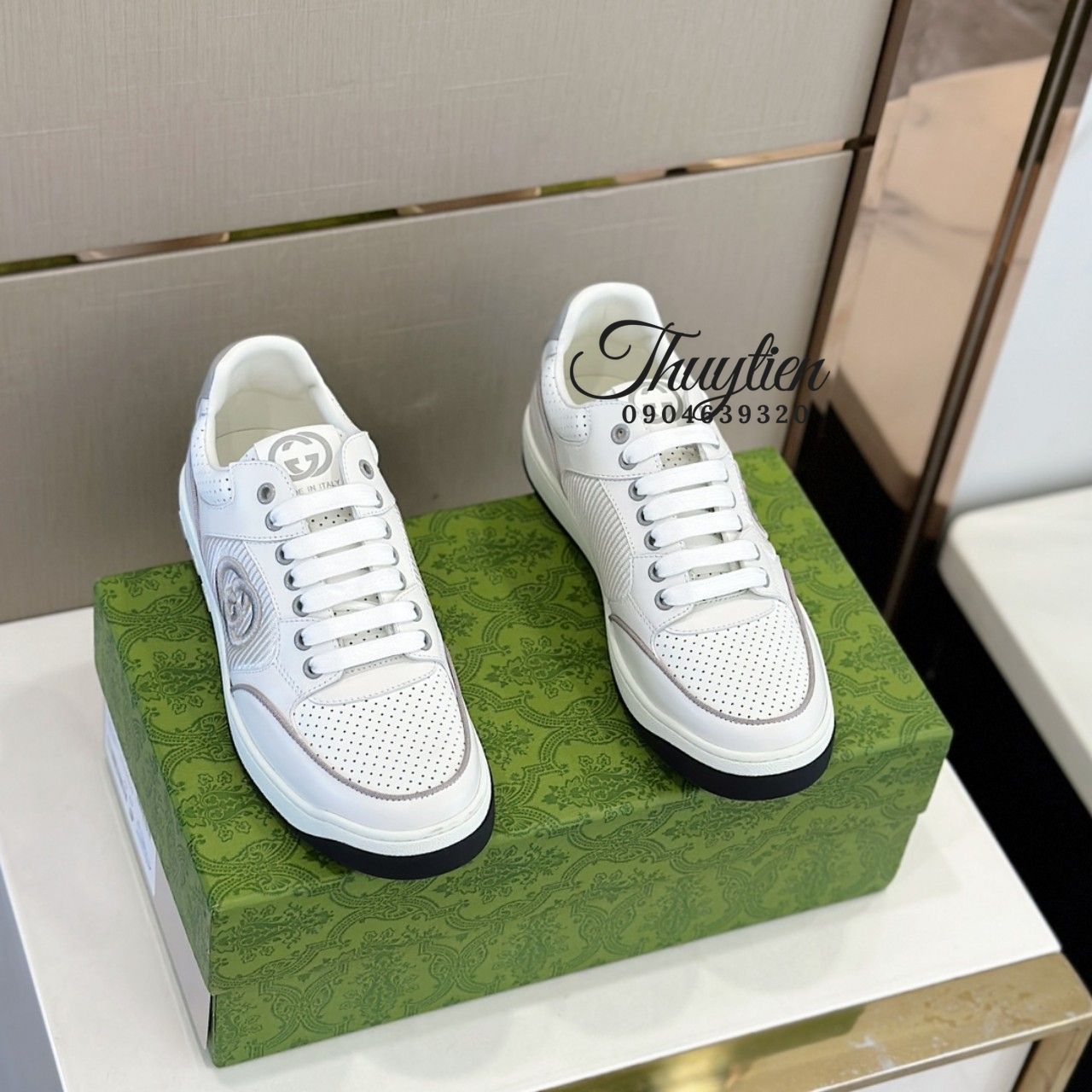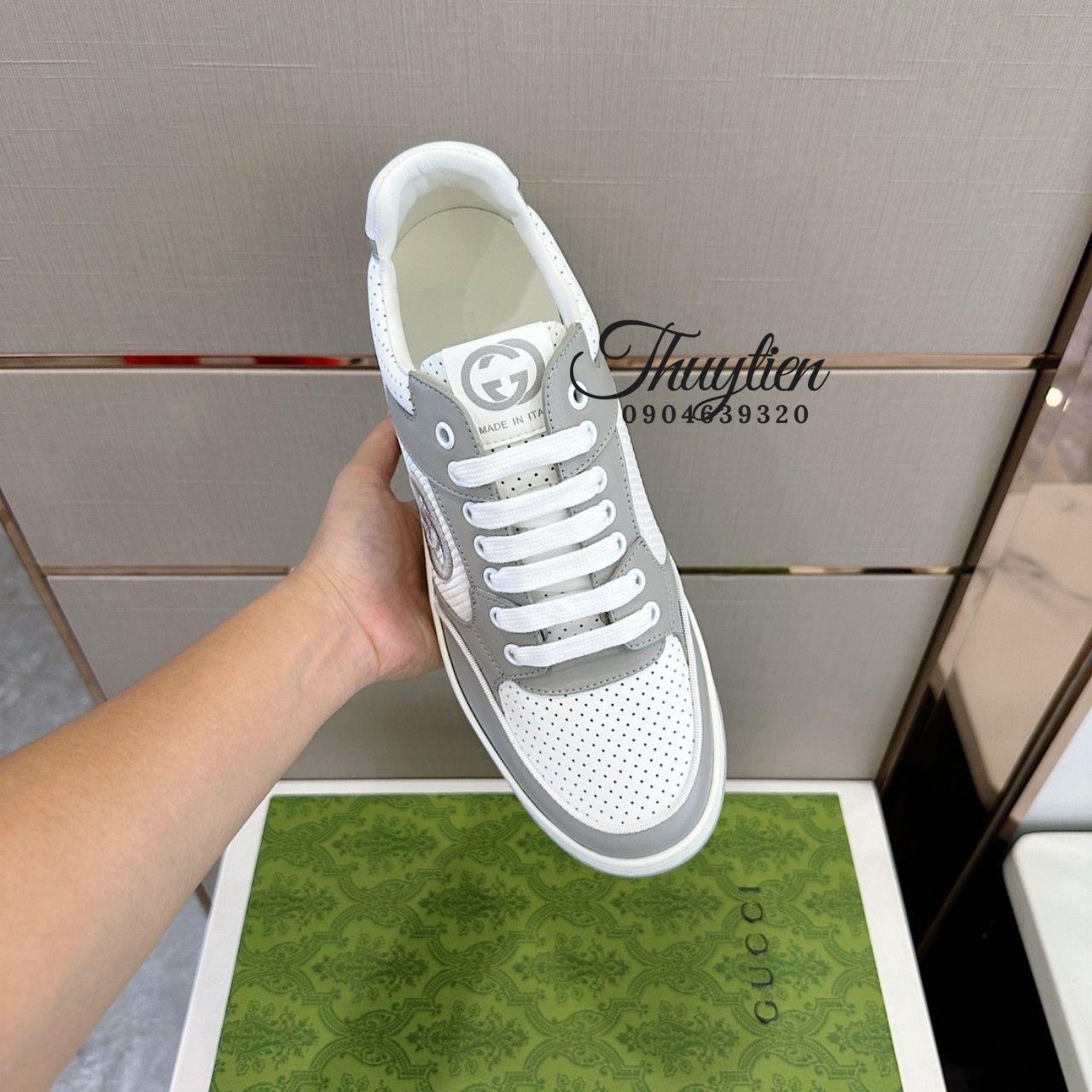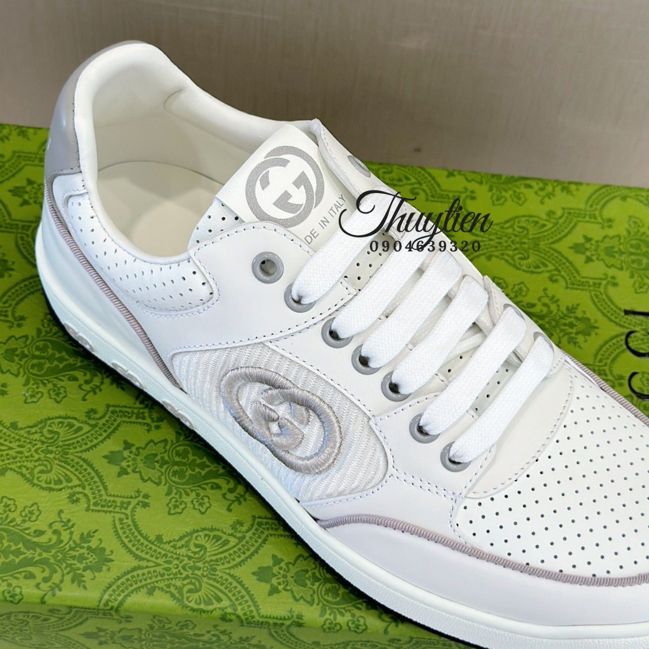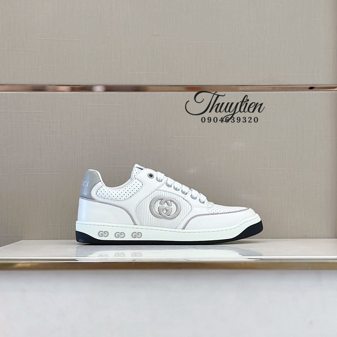 • Giày thể thao cột dây Gucci nam da thật màu trắng