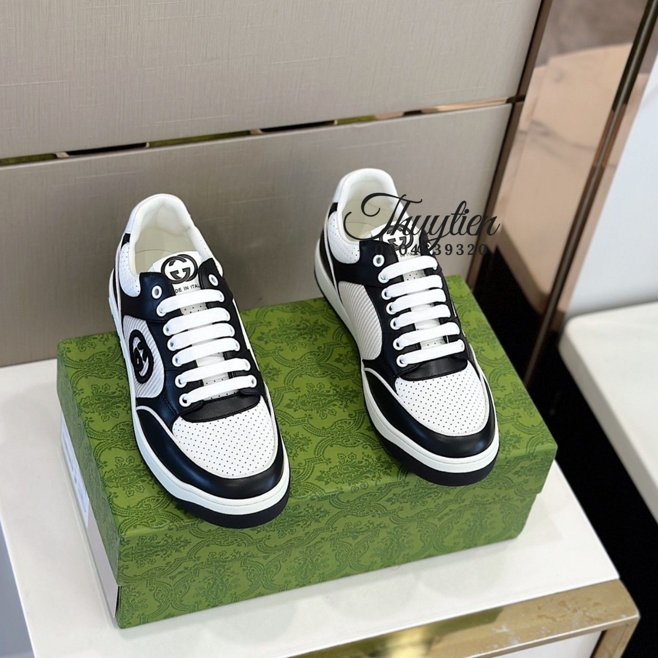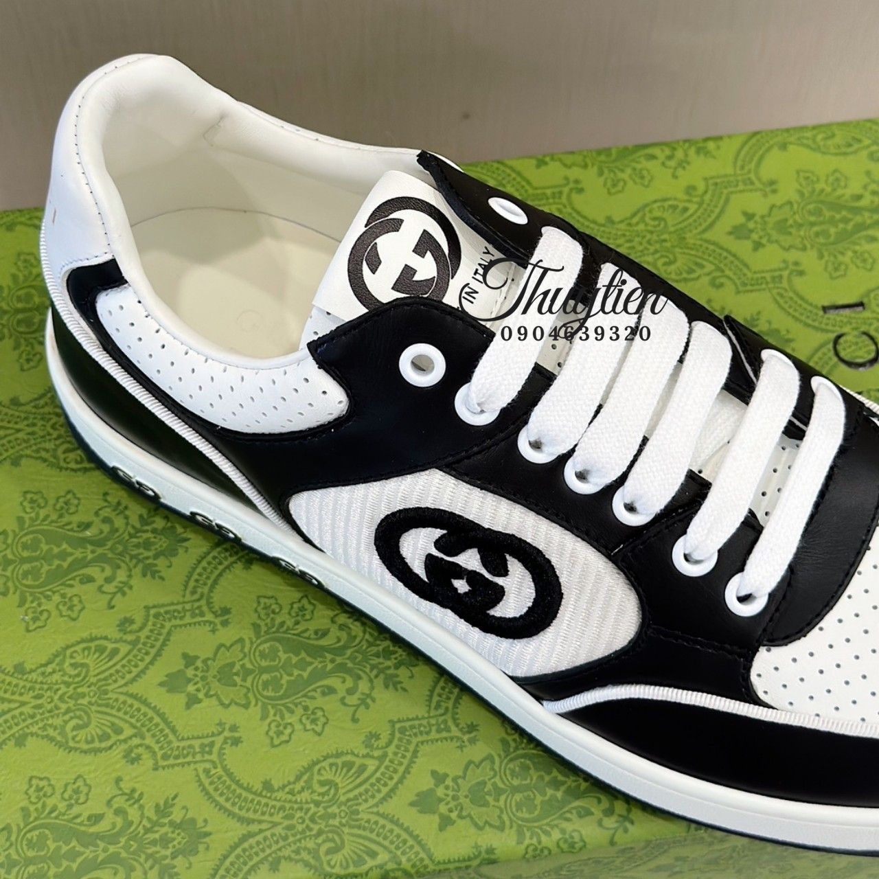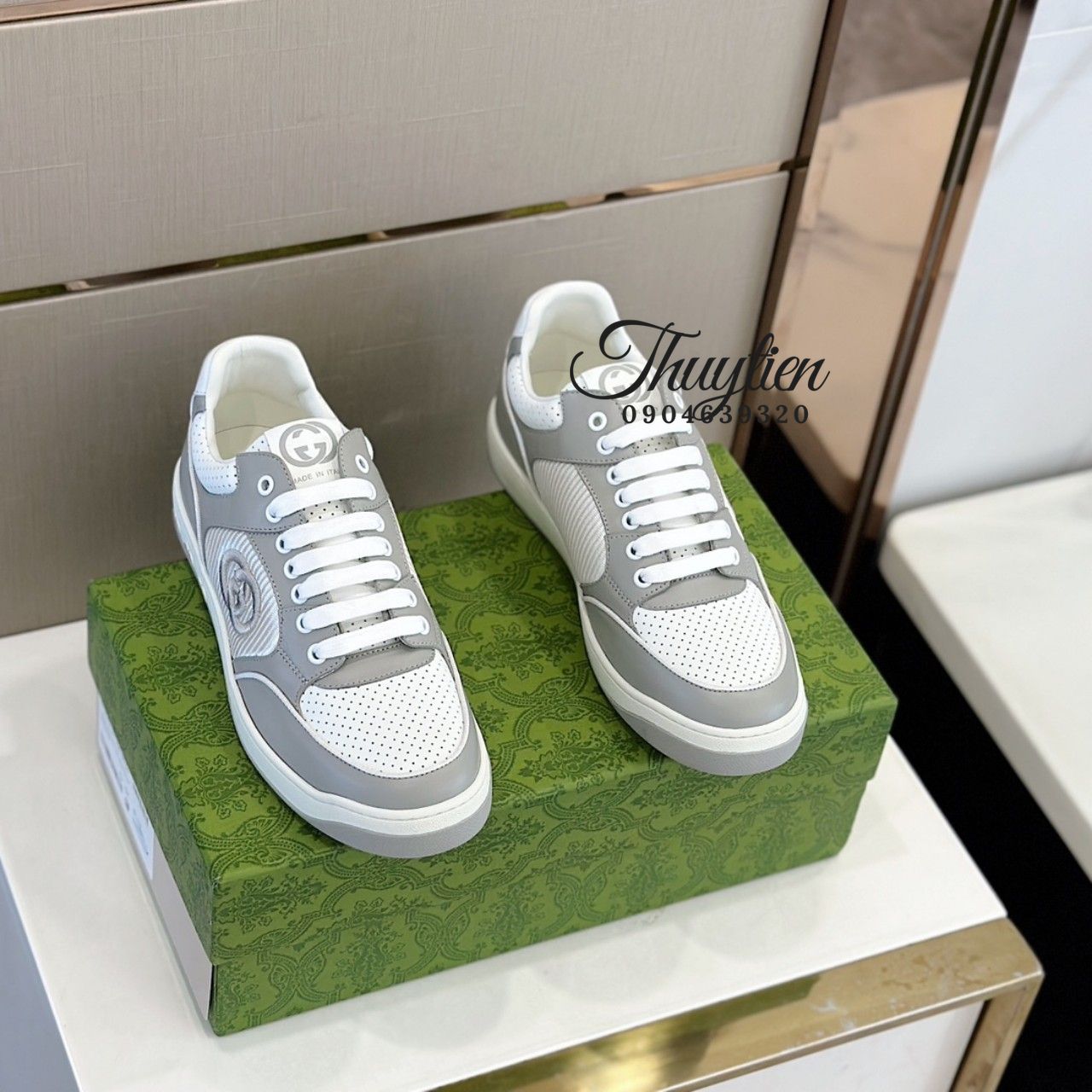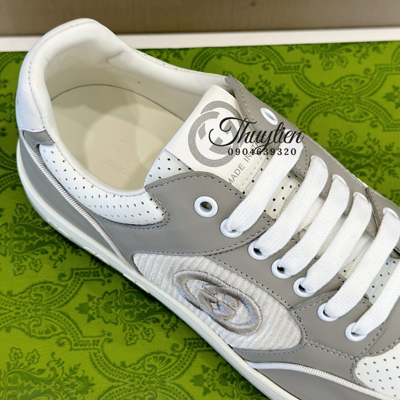 • Giày thể thao cột dây Gucci nam da thật màu trắng